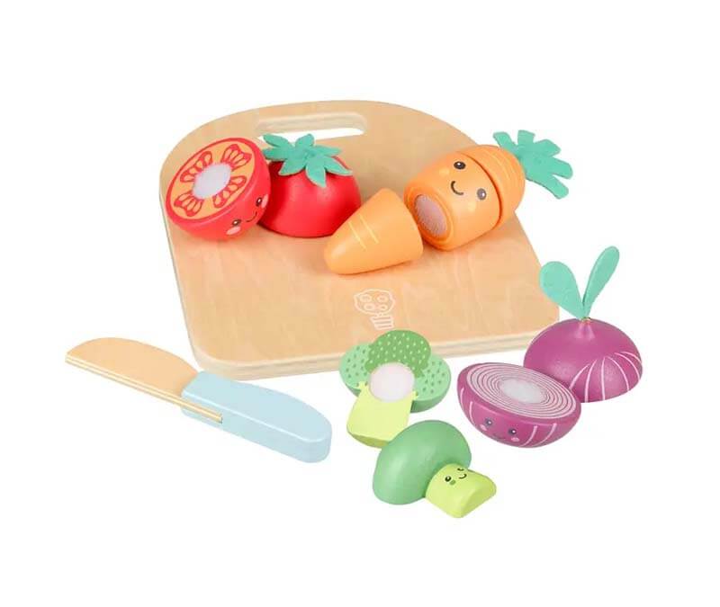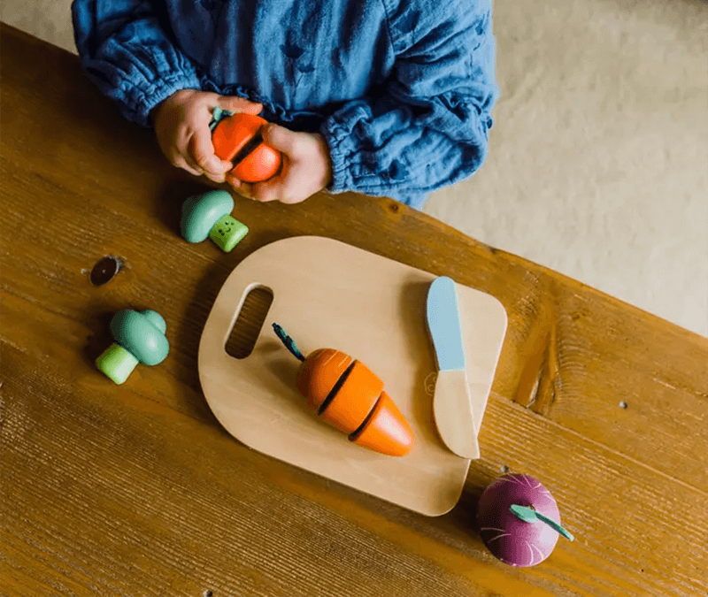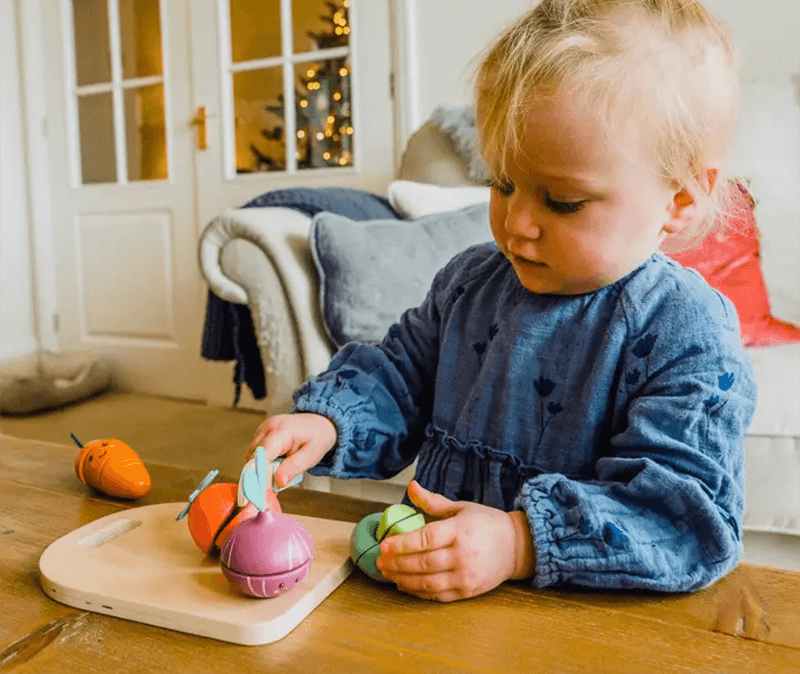 Great for encouraging hand-eye coordination, motor skills and dexterity. Can also help with imaginative and social play while learning real life skills of cutting up food. Why not try talking about the names of each fruit of veggie and trying them all for yourself at snack time?